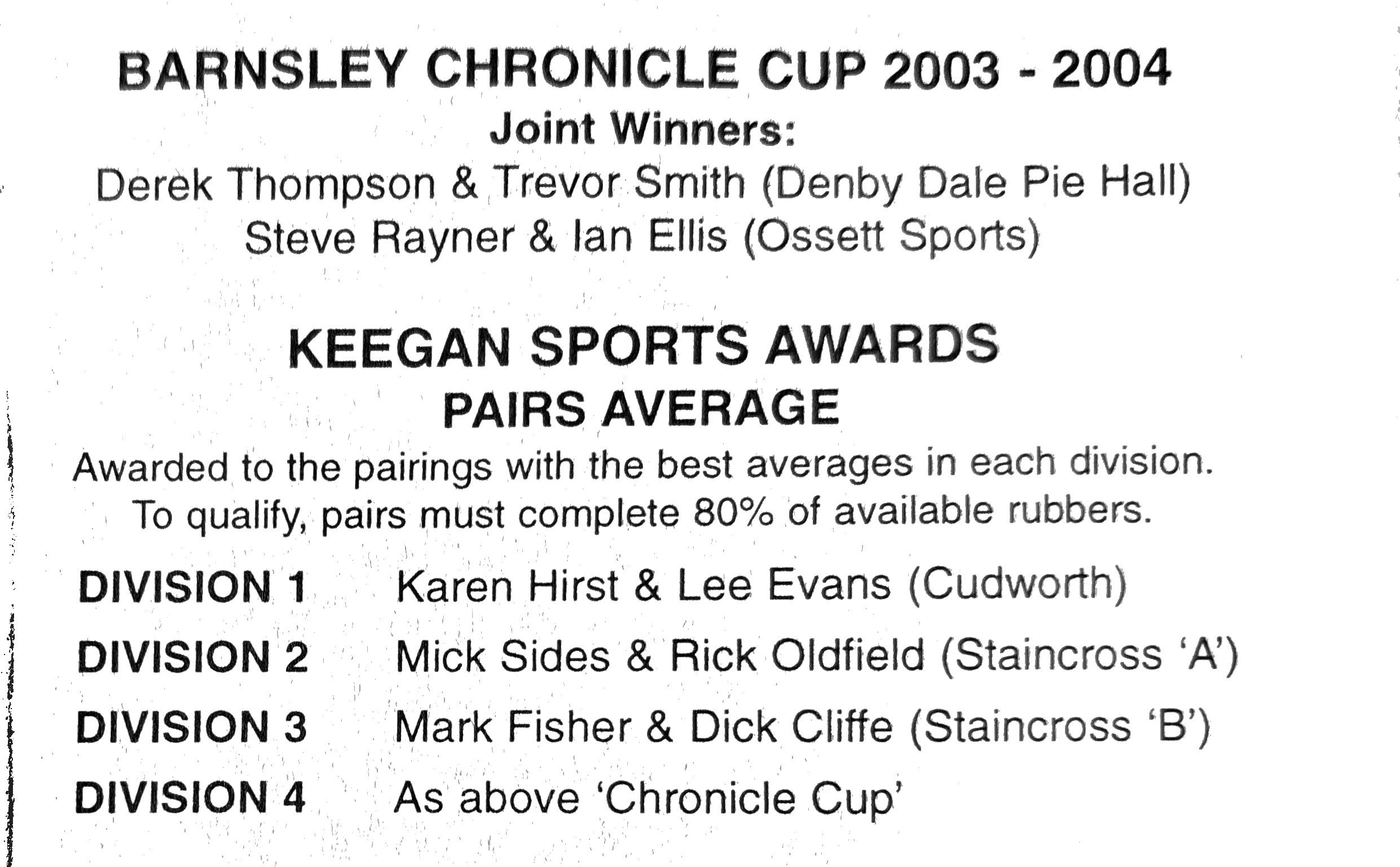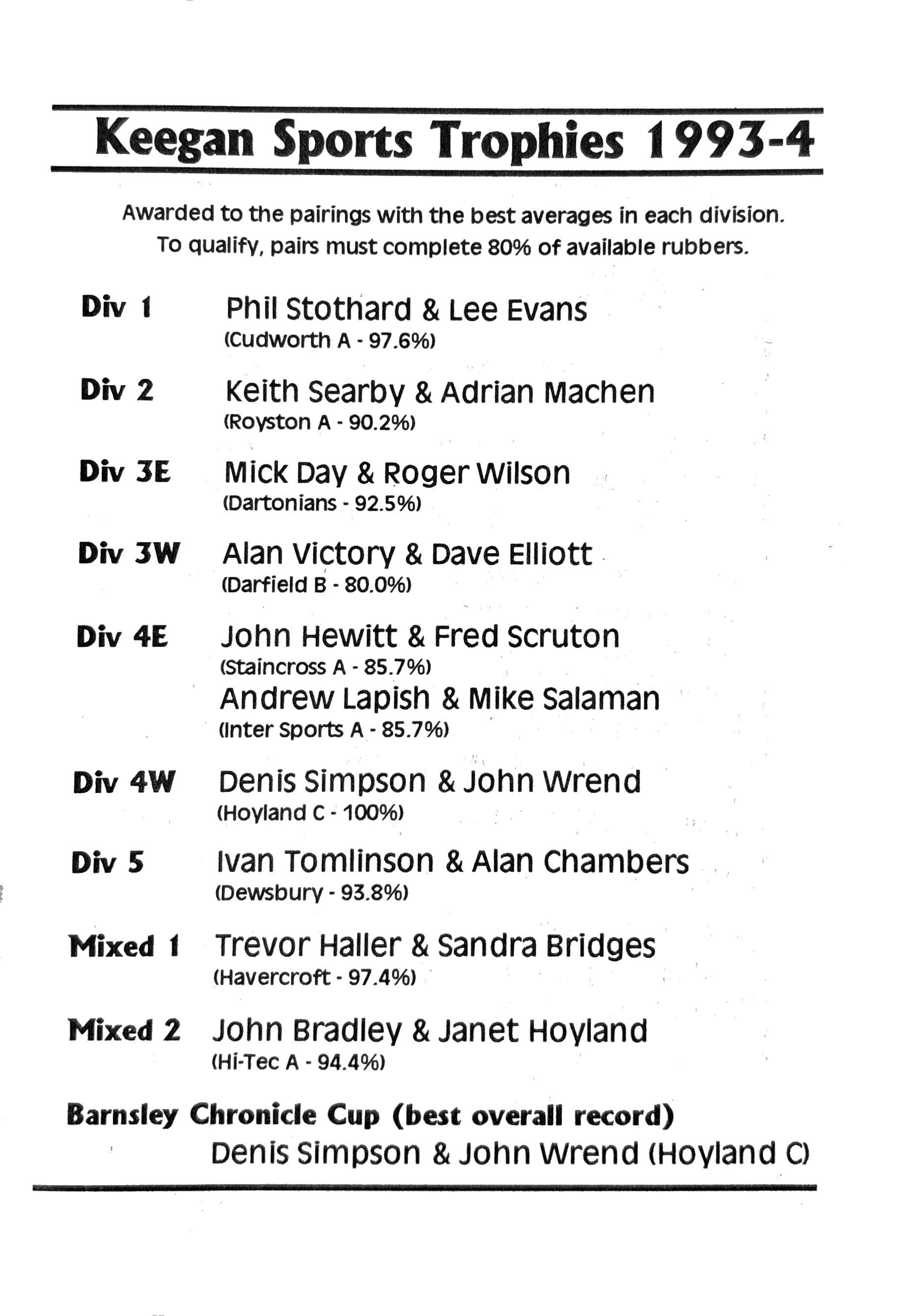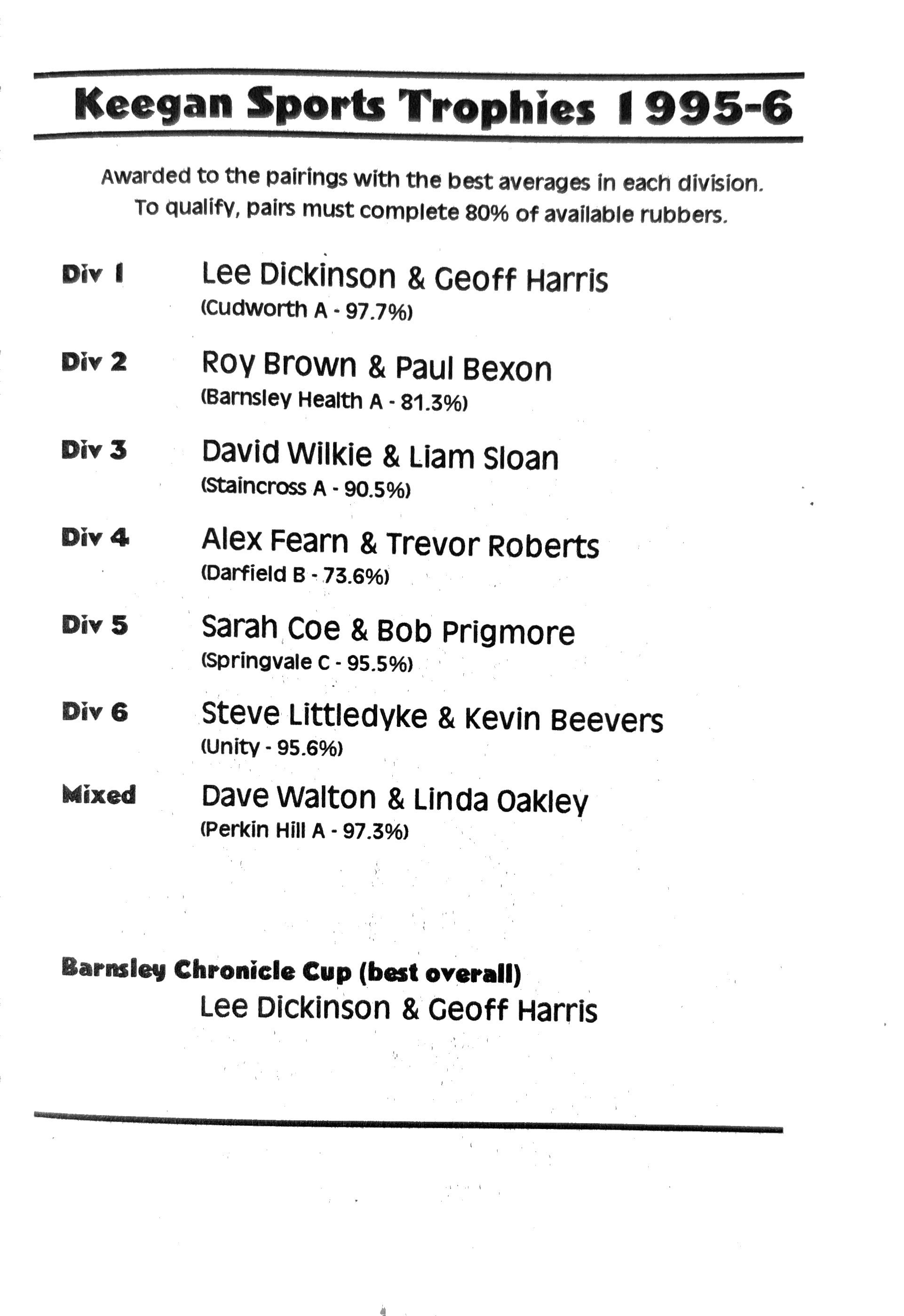 | Division 3 and Overall | D Hobson / M Hinchliffe - Staincross B 97% |