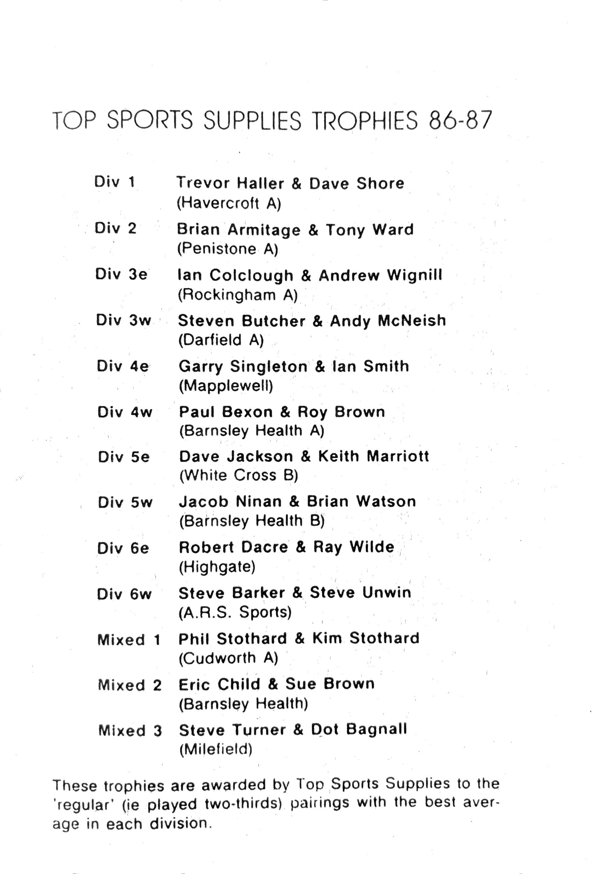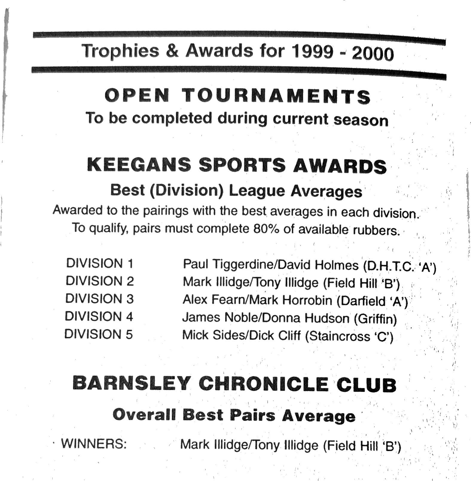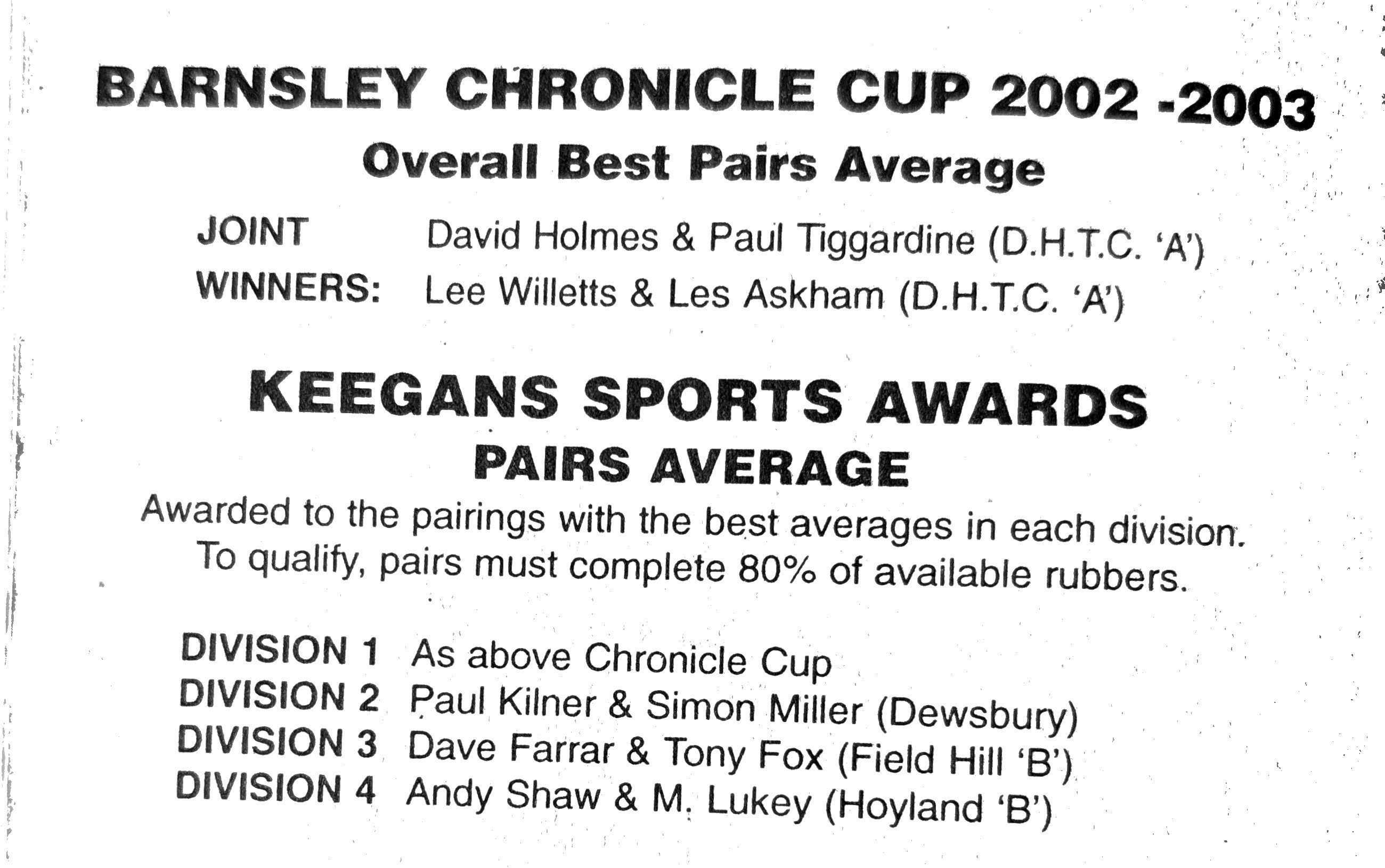 | Division 3 and Overall | D Hobson / M Hinchliffe - Staincross B 97% |
